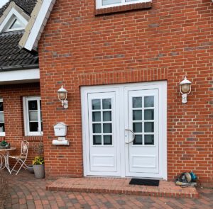 Mit der Wahl der neuen Haustür hat die Hausherrin ihren ausgezeichneten Geschmack und ihr Gespür für einen stilvollen Eingangsbereich bewiesen. Aus einer in die Jahre gekommenen Holz-Haustür wurde eine moderne, pflegeleichte Kunststoff-Doppeltür im klassischen Landhausstil.