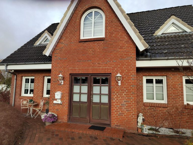 Bessere Wärmedämmung und ein freundlicher Empfangsbereich – passend zur Klinkerfassade und zur weißen Fensteroptik.